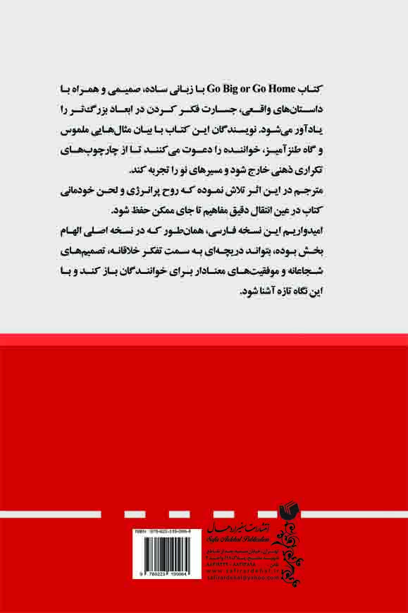 کتاب Go Big or Go Home با زبانی ساده، صمیمی و همراه با داستان‌های واقعی، جسارت فکر کردن در ابعاد بزرگ‌تر را یادآور می‌شود. نویسندگان این کتاب با بیان مثال‌هایی ملموس و گاه طنز‍آمیز، خواننده را دعوت می‌کنند تا از چارچوب‌های تکراری ذهنی خارج شود و مسیر‌های نو را تجربه کند. مترجم در این اثر تلاش نموده که روح پر‌انرژی و لحن خودمانی کتاب در عین انتقال دقیق مفاهیم تا جای ممکن حفظ شود. امیدواریم این نسخه فارسی، همان‌طور که درنسخه اصلی الهام بخش بوده، بتواند دریچه‌ای به سمت تفکر خلاقانه، تصمیم‌های شجاعانه و موفقیت‌های معنادار برای خوانندگان باز کند و با این نگاه تازه آشنا شود.